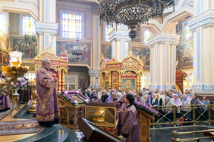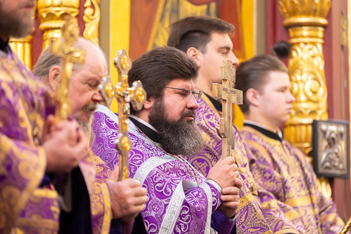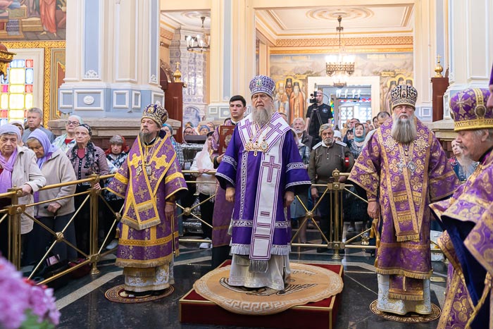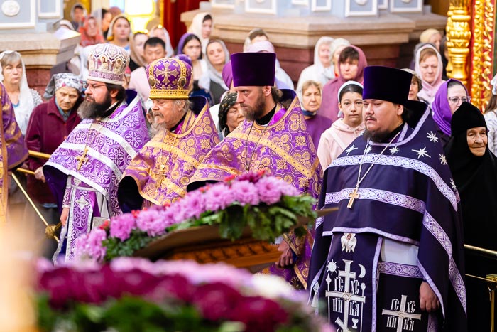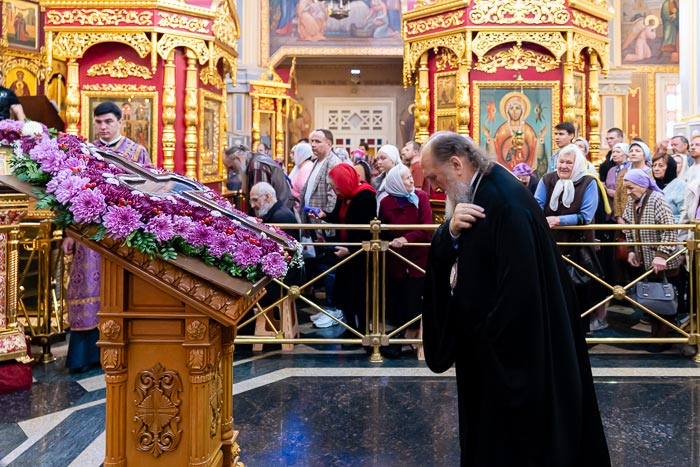 Литургия завершилась славлением перед Крестом Господним – духовенство, хор и народ пропели тропарь, кондак и величание празднику, а также стихиру «Кресту Твоему покланяемся, Владыко…».