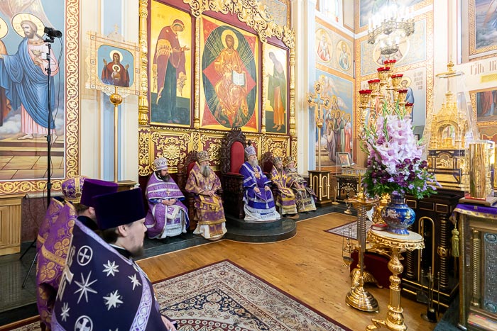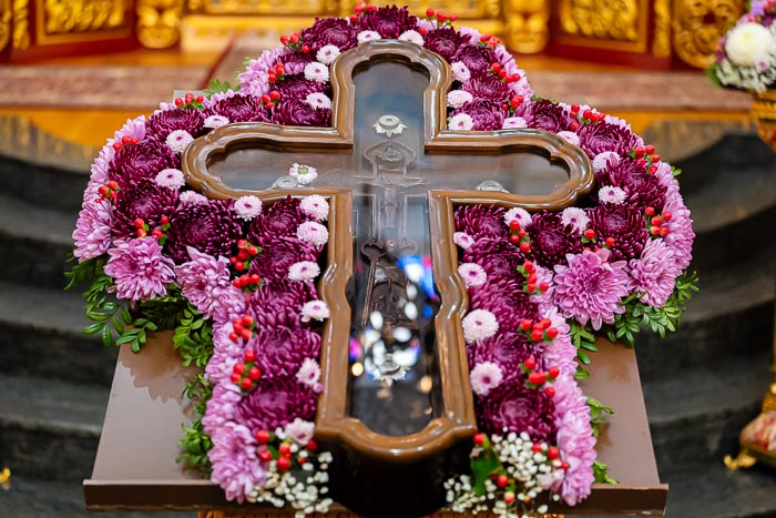 На аналое в центре храма возлежали изнесенный накануне Крест – дар приснопамятного Блаженнейшего Патриарха Иерусалимского Диодора с частицами Животворящего Древа Креста Господня.