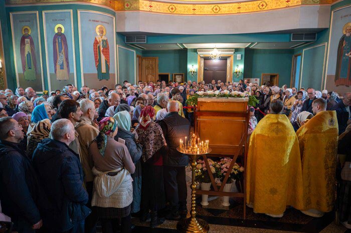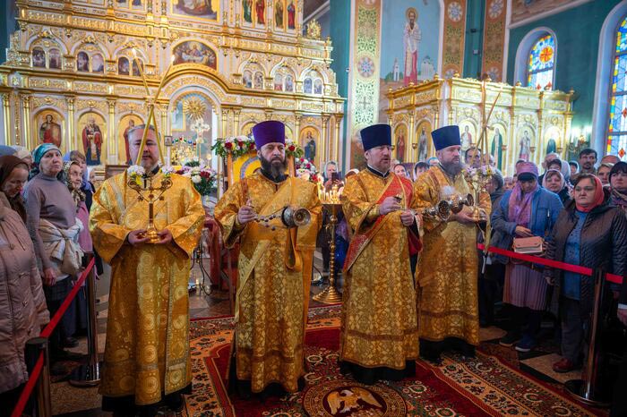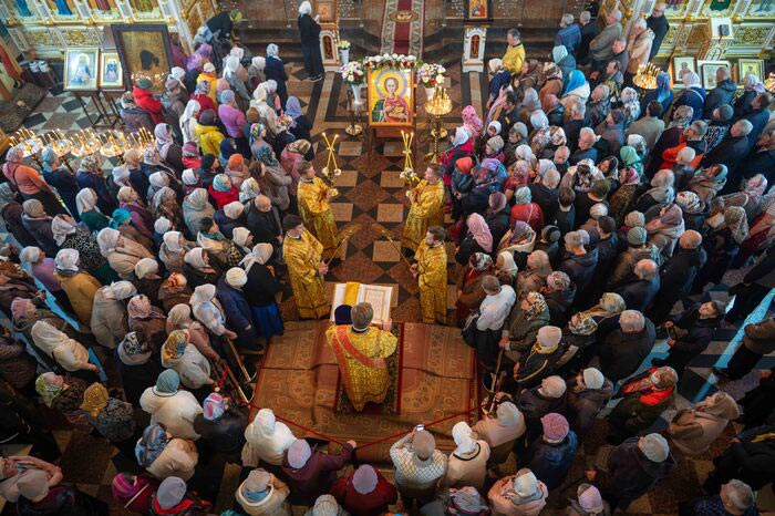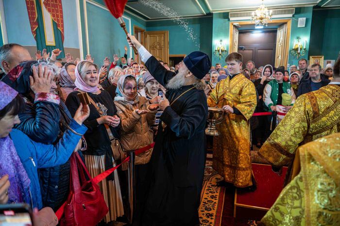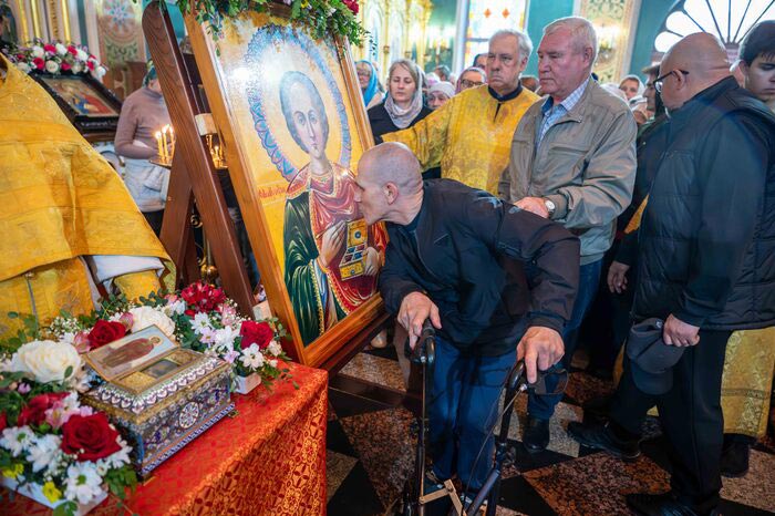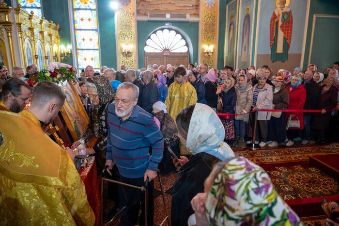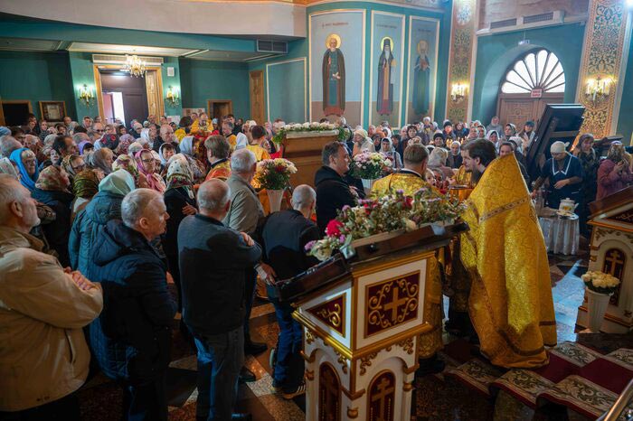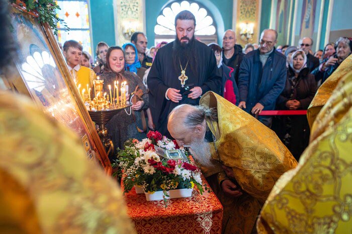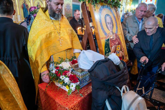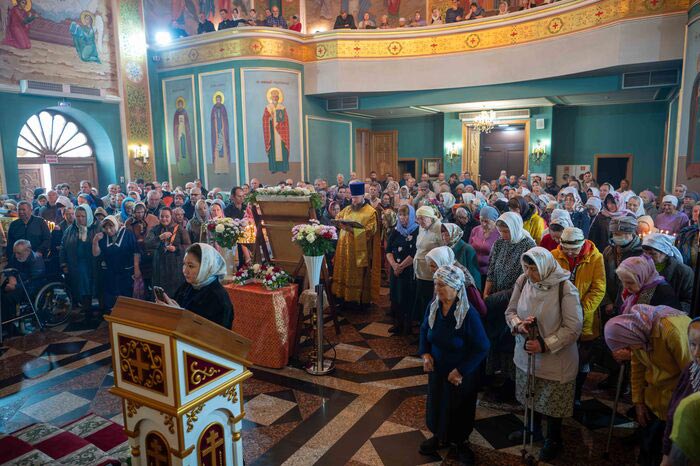 По завершении богослужения в Иоанно-Богословском кафедральном соборе продолжилось поклонение верующих мощам великомученика Пантелеимона.