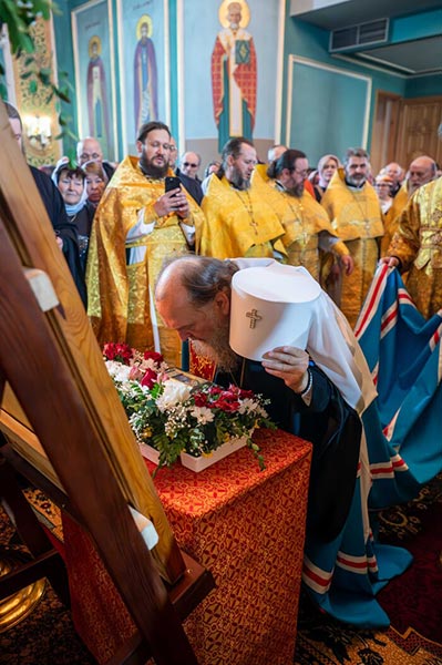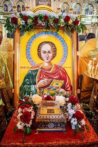 В завершение Литургии состоялось славление великомученику Пантелеимону перед ковчегом с частью мощей святого целителя.