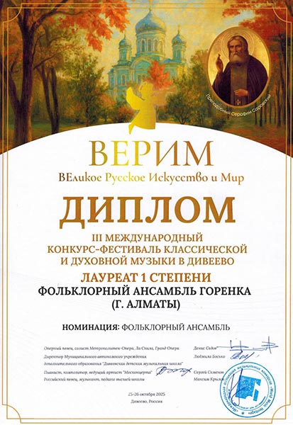 Фольклорный ансамбль «Горенка» под руководством Анастасии Стаценко при воскресной школе Вознесенского кафедрального собора города Алматы стал лауреатом I степени III Международного музыкального конкурса-фестиваля классической и духовной музыки «Верим!», прошедшего в селе Дивеево 25–26 октября 2025 года.