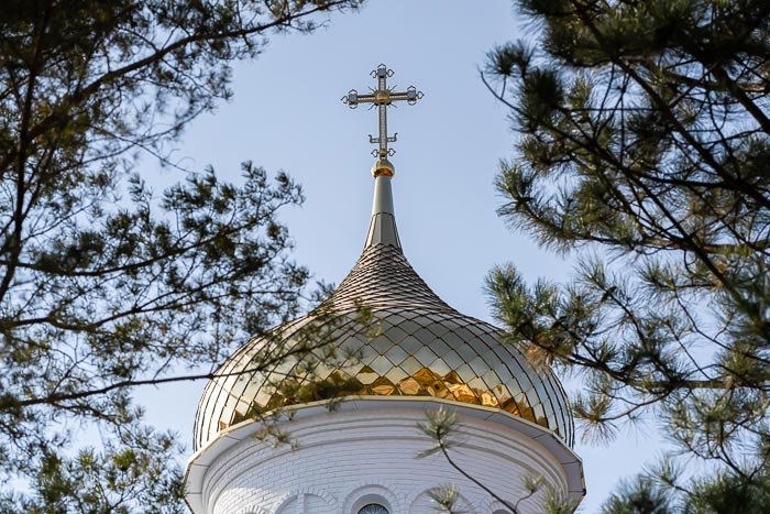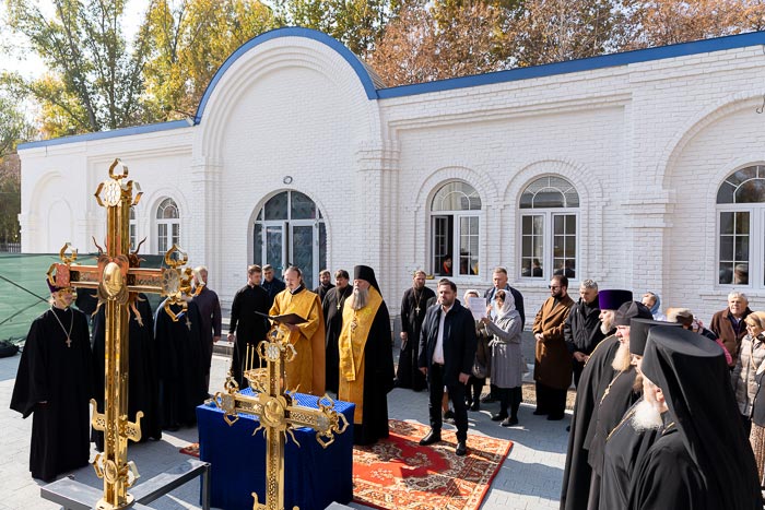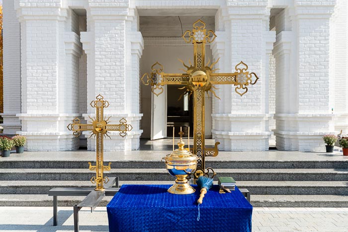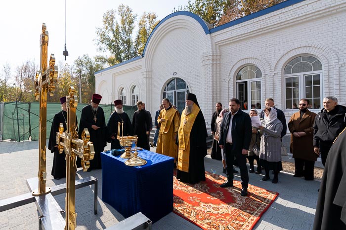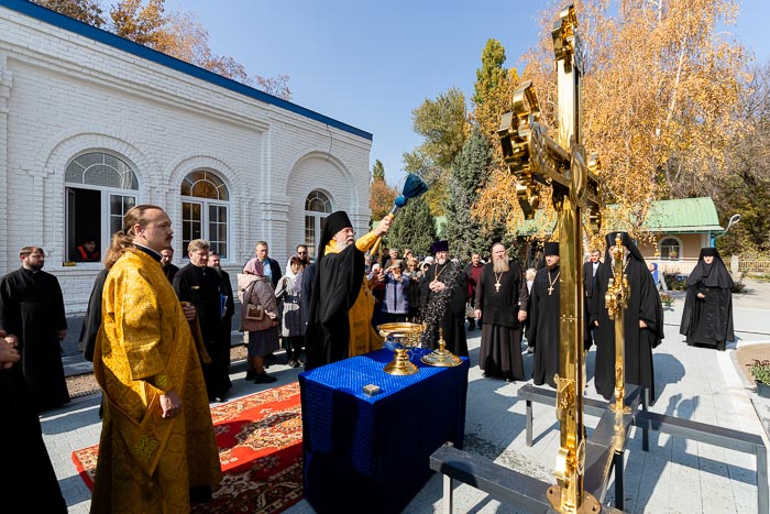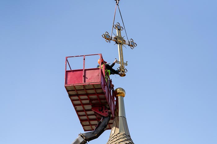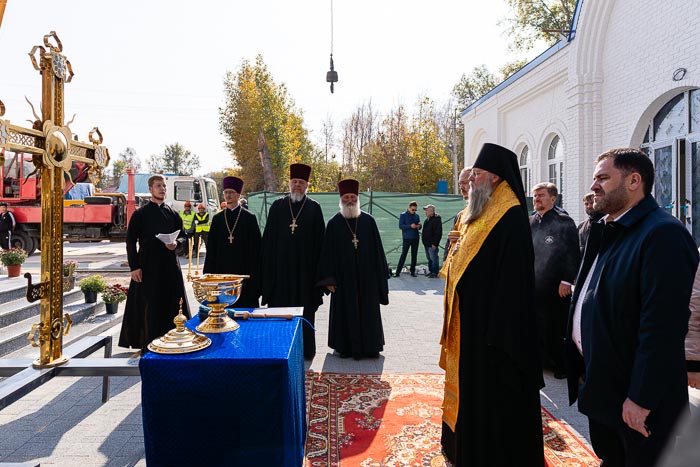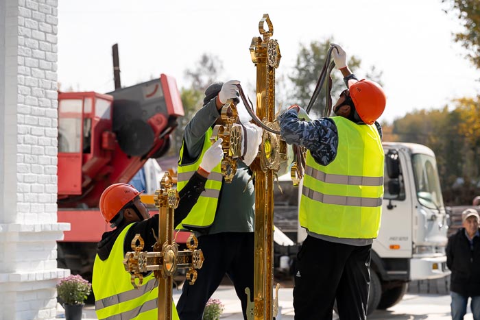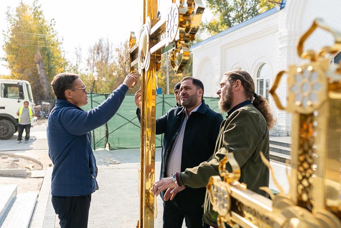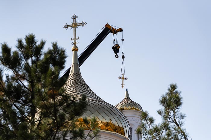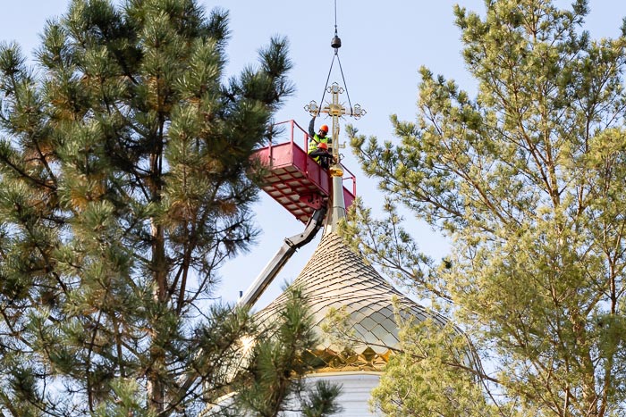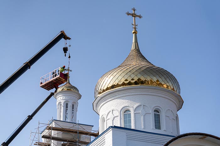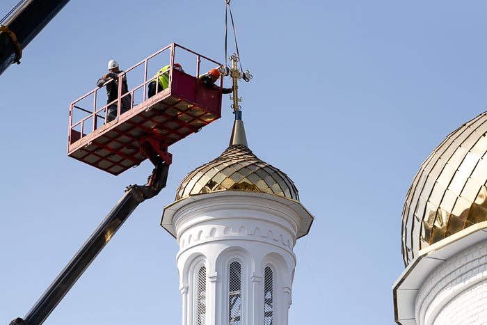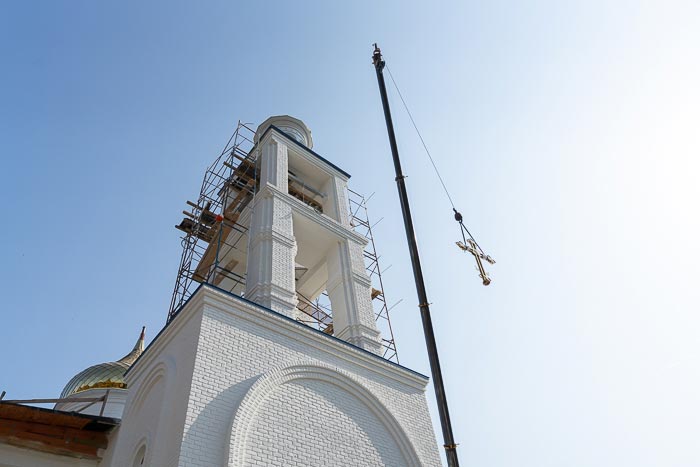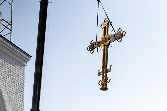 После прочтения уставных молитв архипастырь окропил кресты святой водой. При пении тропарей и стихир их установили на центральный купол и на верх колокольни.