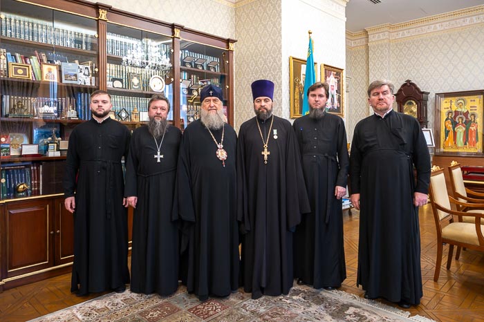 Во встрече приняли участие: руководитель информационного отдела Православной Церкви Казахстана протоиерей Евгений Иванов; руководитель личного секретариата митрополита иеромонах Прохор (Ендовицкий); руководитель службы протокола Главы Митрополичьего округа протодиакон Роман Головин; помощник митрополита диакон Даниил Пасюк.